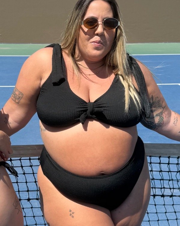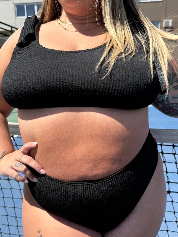 Corpiño confeccionado en lycra texturada importada de Brasil, sus breteles de tela para atar a los hombros son anchos. A su vez la espalda también es con lazos para atar lo que permite regular la medida del contorno. Podes usarlo con el lazo extra atado al medio del busto para generar escote, sacarlo, o usarlo atado en el costado de la bombacha para hacer juego.