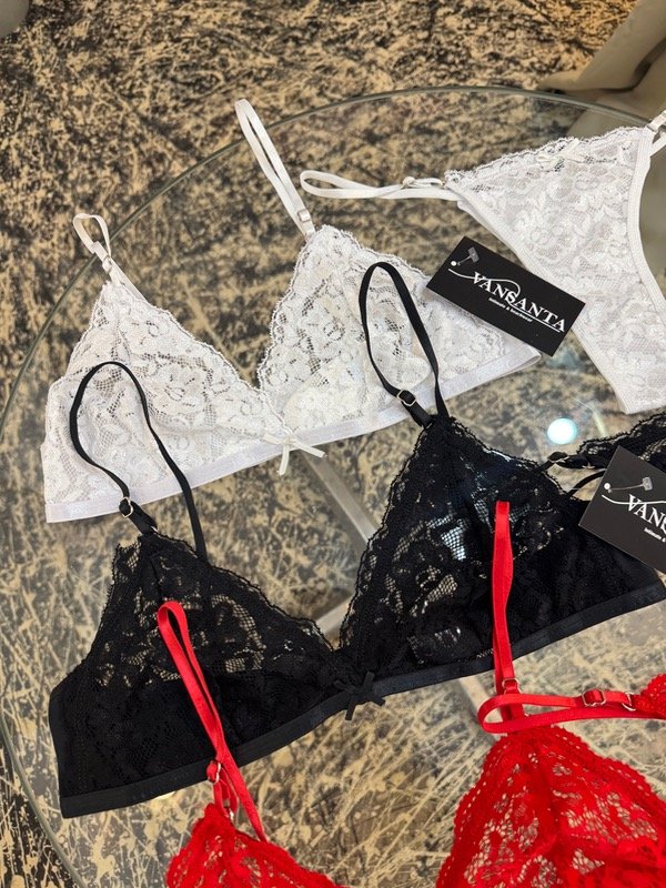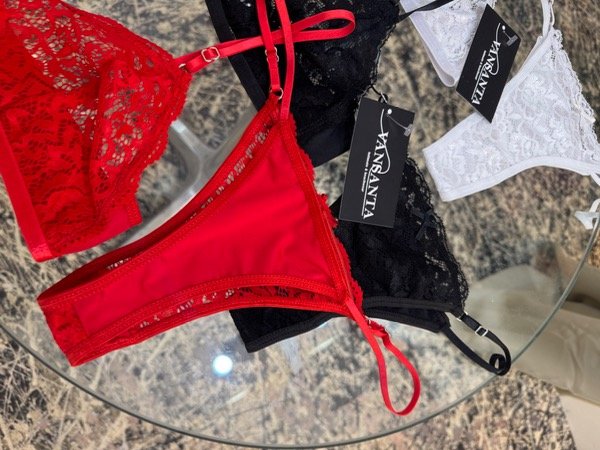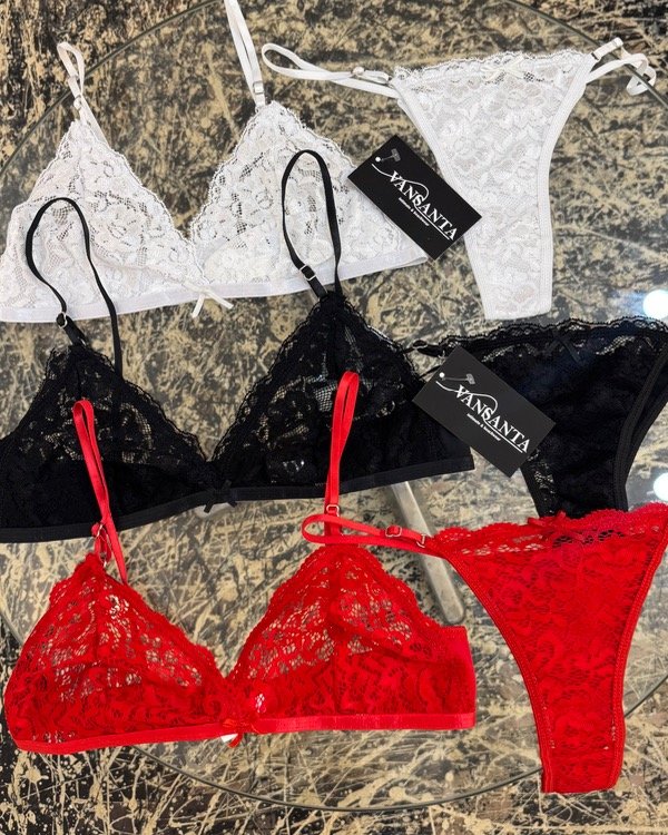conjunto de corpiño tipo triángulo con breteles regulables y espalda con coleta y broche de dos posiciones, en puntilla + less regulable de puntilla y microfibra, tiro medio con moño . comodo y sexy🩷