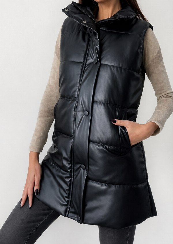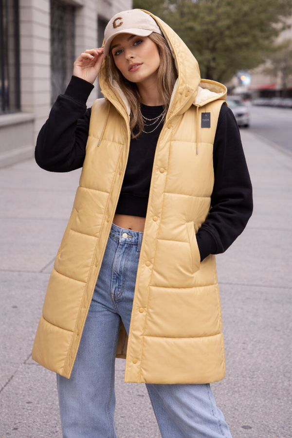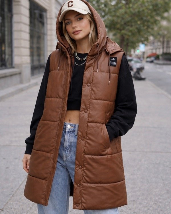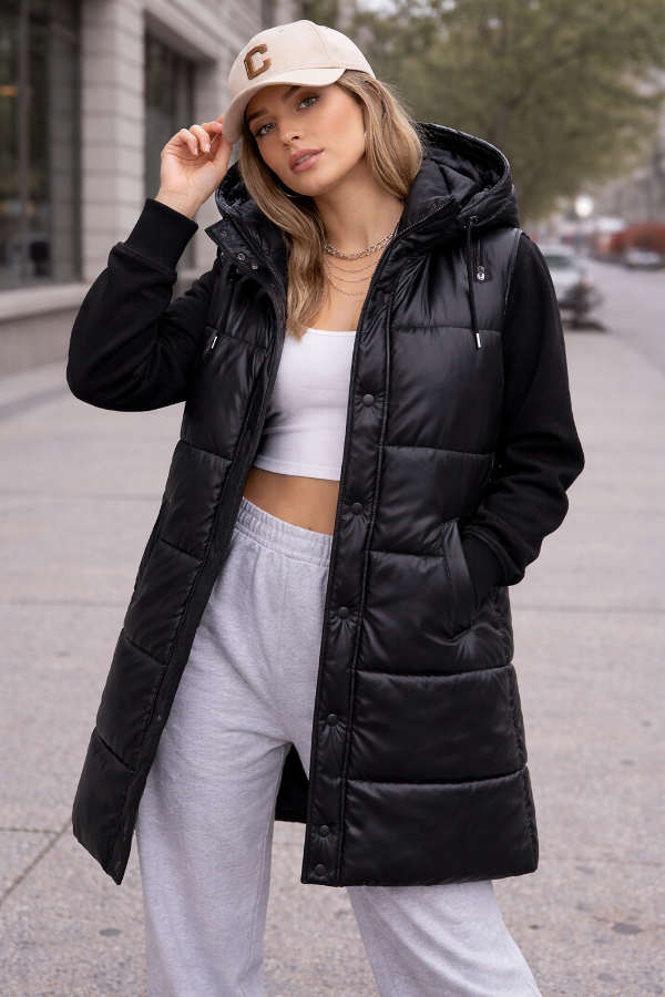 Chaleco puffer engomado largo, tiene capucha desmontable (se saca y se pone mediante un cierre), tancas de ajuste, bolsillos en ambos laterales, cierre frontal y tapa cierre.