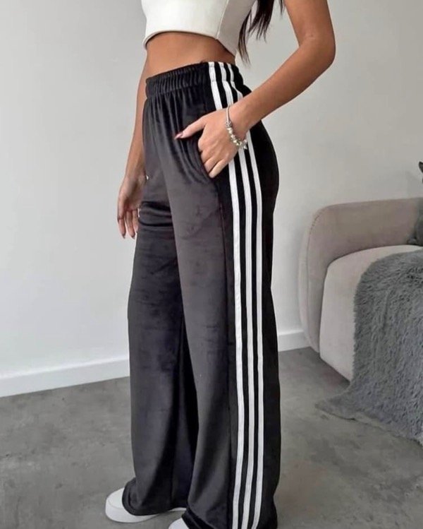 Pantalón de jogging tipo palazo con corte ancho/recto. Tiene elástico interno en cintura y bolsillos laterales. Líneas a los costados (no lleva marca). Camperita tipo buzo con cierre y capucha, bolsillos. Llega justo a la cintura o hasta que comienza el pantalón. Confeccionado en plush.