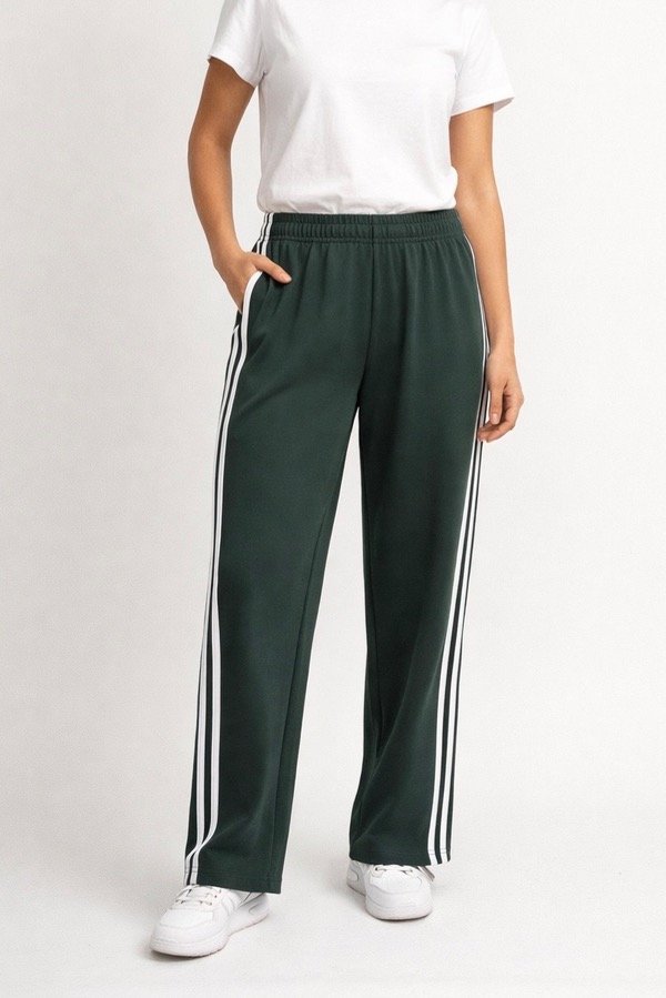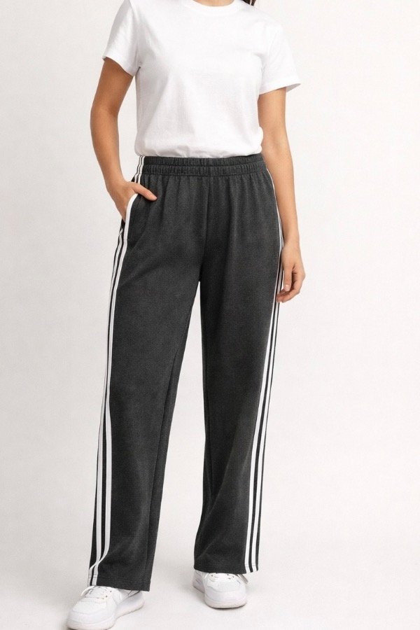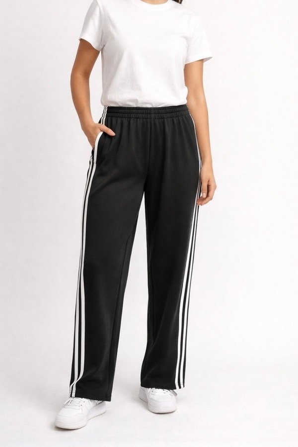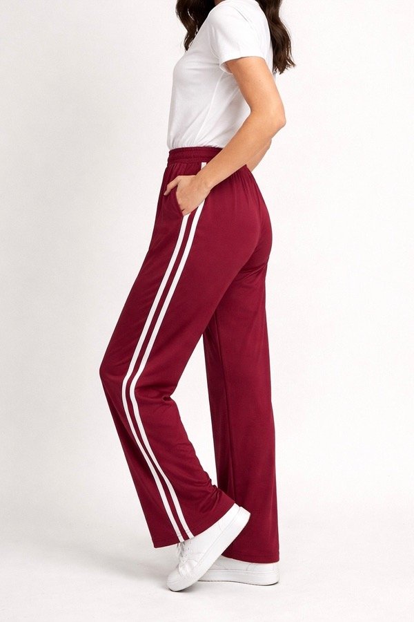 Pantalón de jogging tipo palazo con corte ancho/recto. Tiene elástico interno en cintura y bolsillos laterales. Líneas a los costados (no lleva marca). Confeccionado en lycra (no tiene frisa).