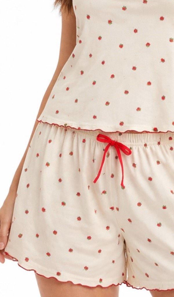 Pijama de dos piezas confeccionado en morley de algodón (elastizado): short con elástico en cintura y moño decorativo adelante, terminación de roulotte, remerita con bretel fijo (no regulable) y terminación de roulotte.