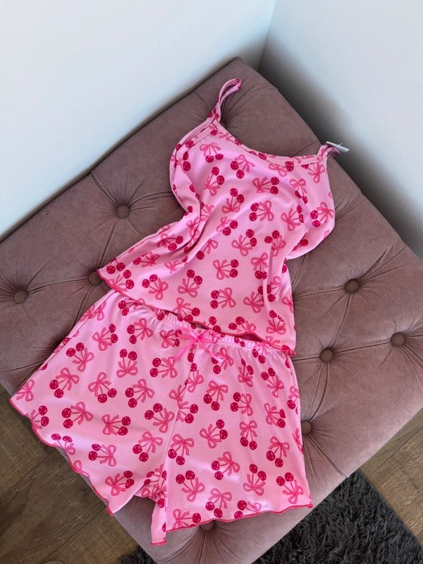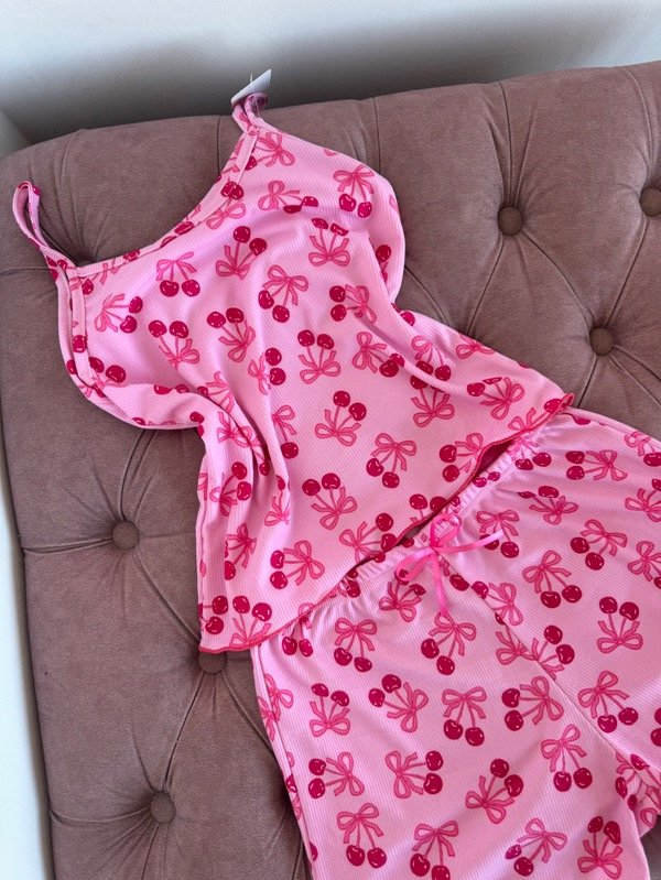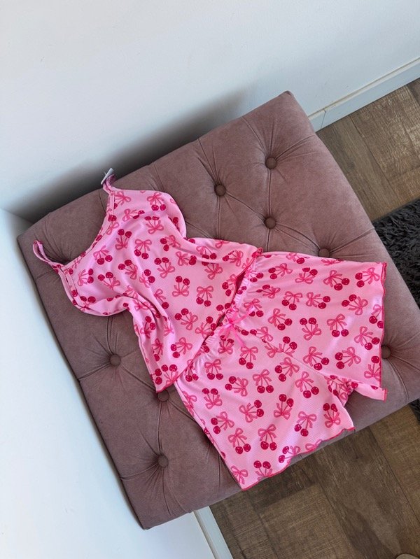 Pijama de dos piezas confeccionado en morley de algodón (elastizado): short con elástico en cintura y moño decorativo adelante, terminación de roulotte, remerita con bretel fijo (no regulable) y terminación de roulotte.