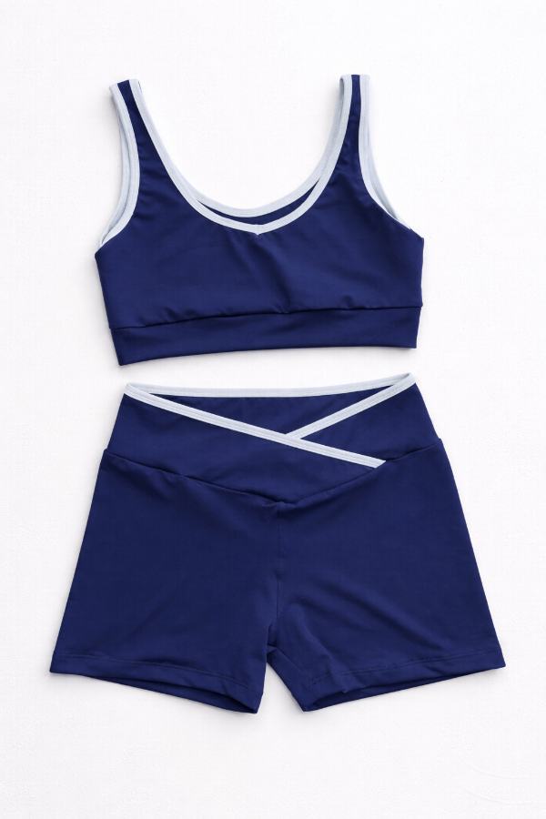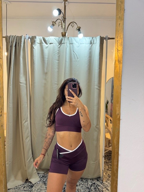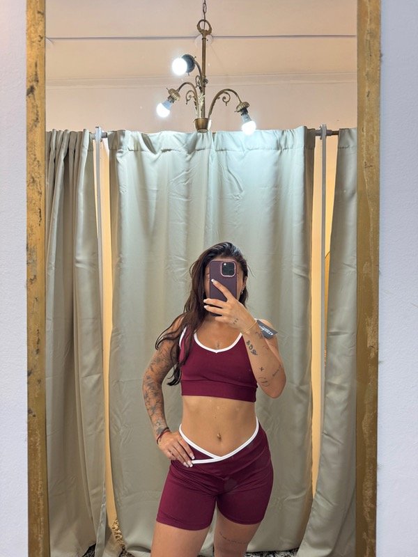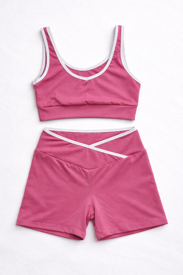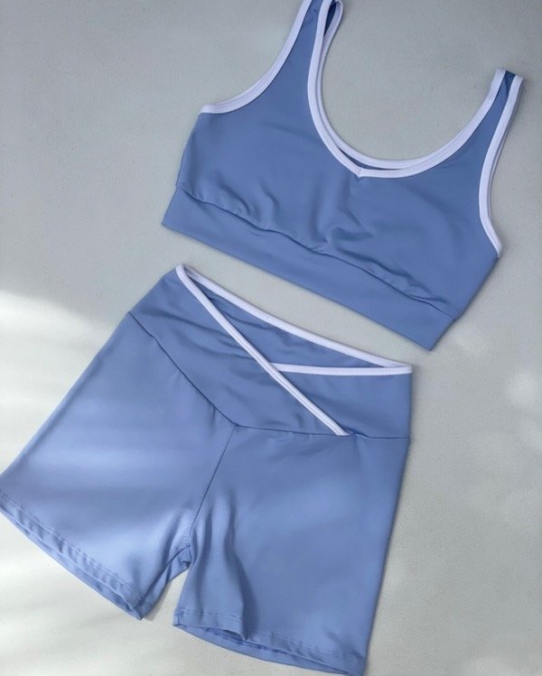 Set sport de top + short en lycra con envivado blanco en los bordes de top y cintura . El top corte deportivo puede usarse de ambos lados (uno más en V y otro más redondo, podes usarlo de delantera o de espalda a gusto). El short es tiro medio, excelente calce y tiene un cruce en V que estiliza la cintura.